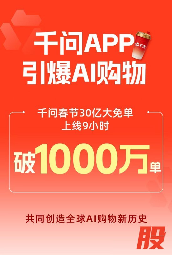新浪科技讯 2月6日下午消息,今日,阿里千问App“春节30亿免单”正式上线,仅9个小时,用户在千问App上的AI订单突破1000万单。