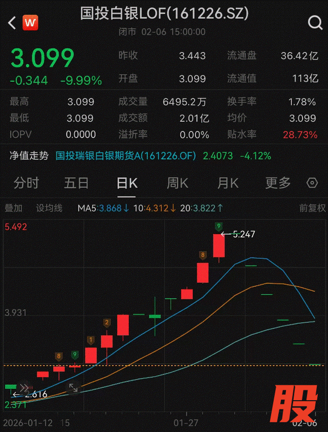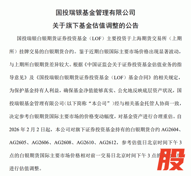 据了解,事件缘于2月2日晚间,国投瑞银发布公告调整旗下白银期货LOF估值,决定参考白银期货国际主要市场的价格变动幅度,对基金资产进行合理重估。最终,该基金当日净值跌幅定格在31.5%。