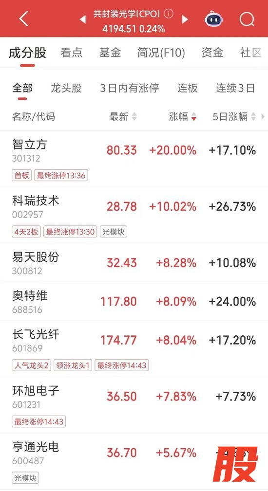 今日午后,CPO(共封装光学)概念持续走高,智立方“20CM”涨停,股价创历史新高,科瑞技术涨停。