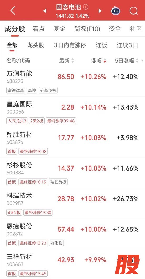今日午后,固态电池概念拉升,皇庭国际、鼎胜新材等多股涨停。